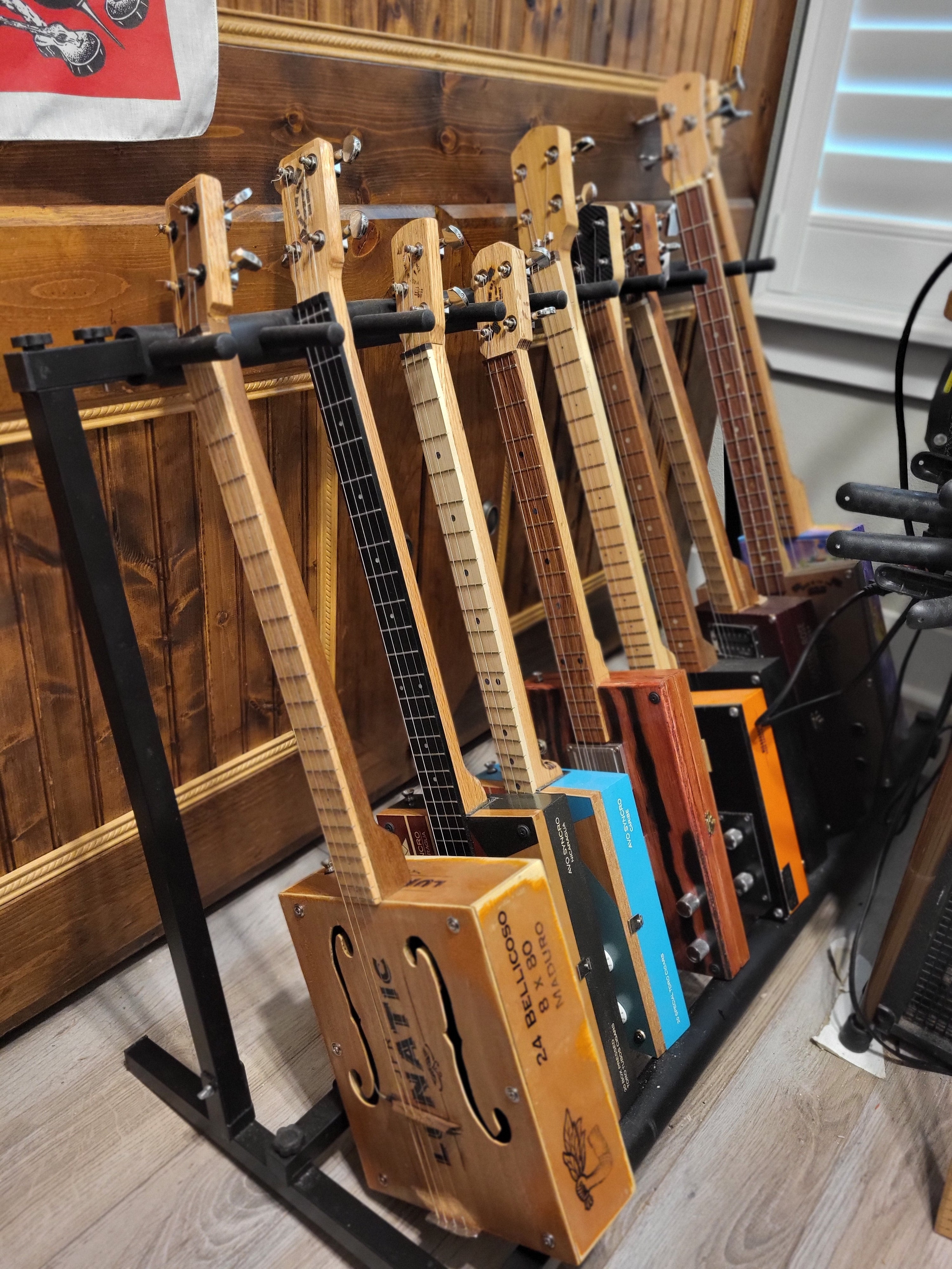 Hand Crafted Cigar Box Guitars. 3,4, and 6 String Cigar Boxes. Practice Amps, Solid Body Guitars. Inventory Changes with time. Please come in and have a look. We are pleased to have you as a customer.