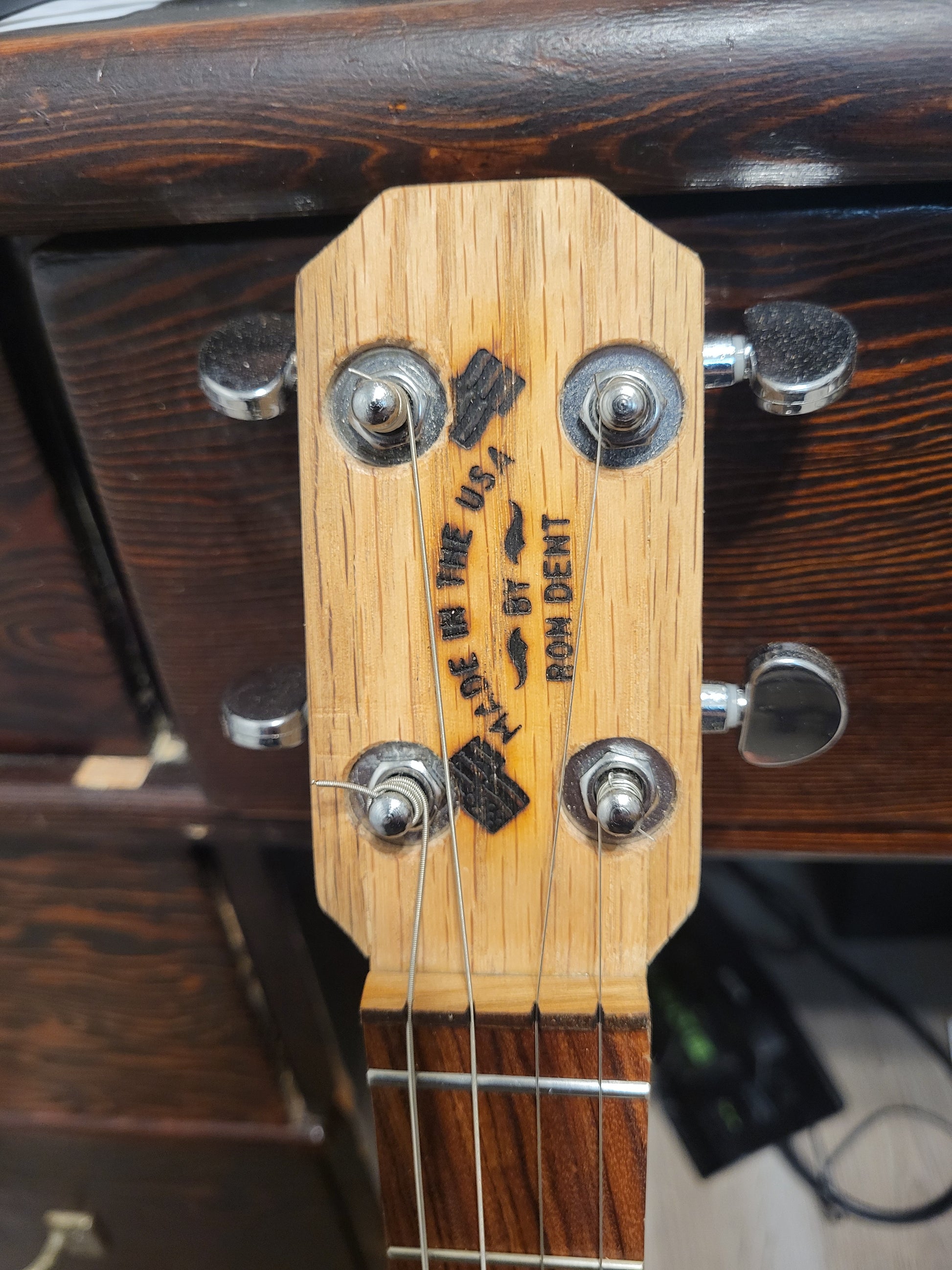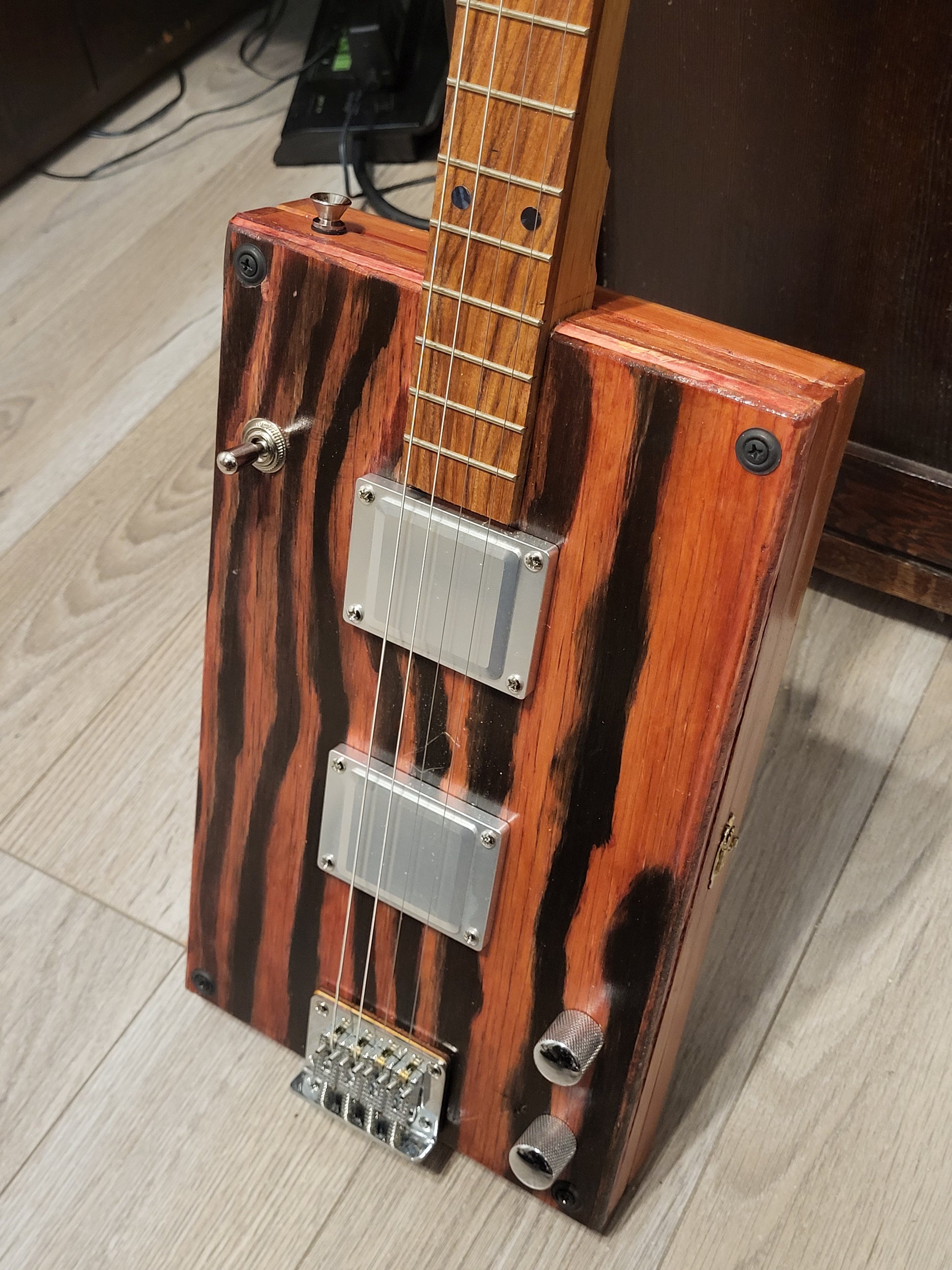 The Zebra! A just right size 4 string Cigar box with a too thin lid. So, I made a new lid that would stand up to what I had in mind. Two flat humbucker pickups with cool covers from MGB. Set up with a LP style switch and Tone/Volume controls with Chrome knobs. A oak neck with Mahogany fret board with a jumbo zero fret. Tune GDBA top to bottom. Sounds nice. The Chrome tuners match the chrome roller bridge, switch, volume/tone knobs, strap buttons and cord jack. Has a 24" scale, strings tuned DGBE top to bottom.